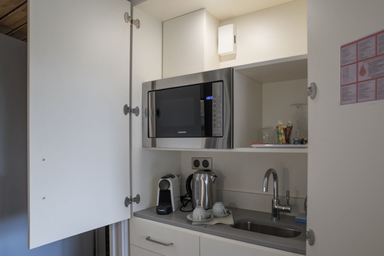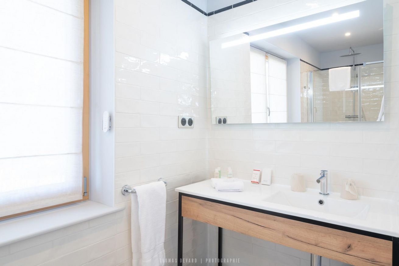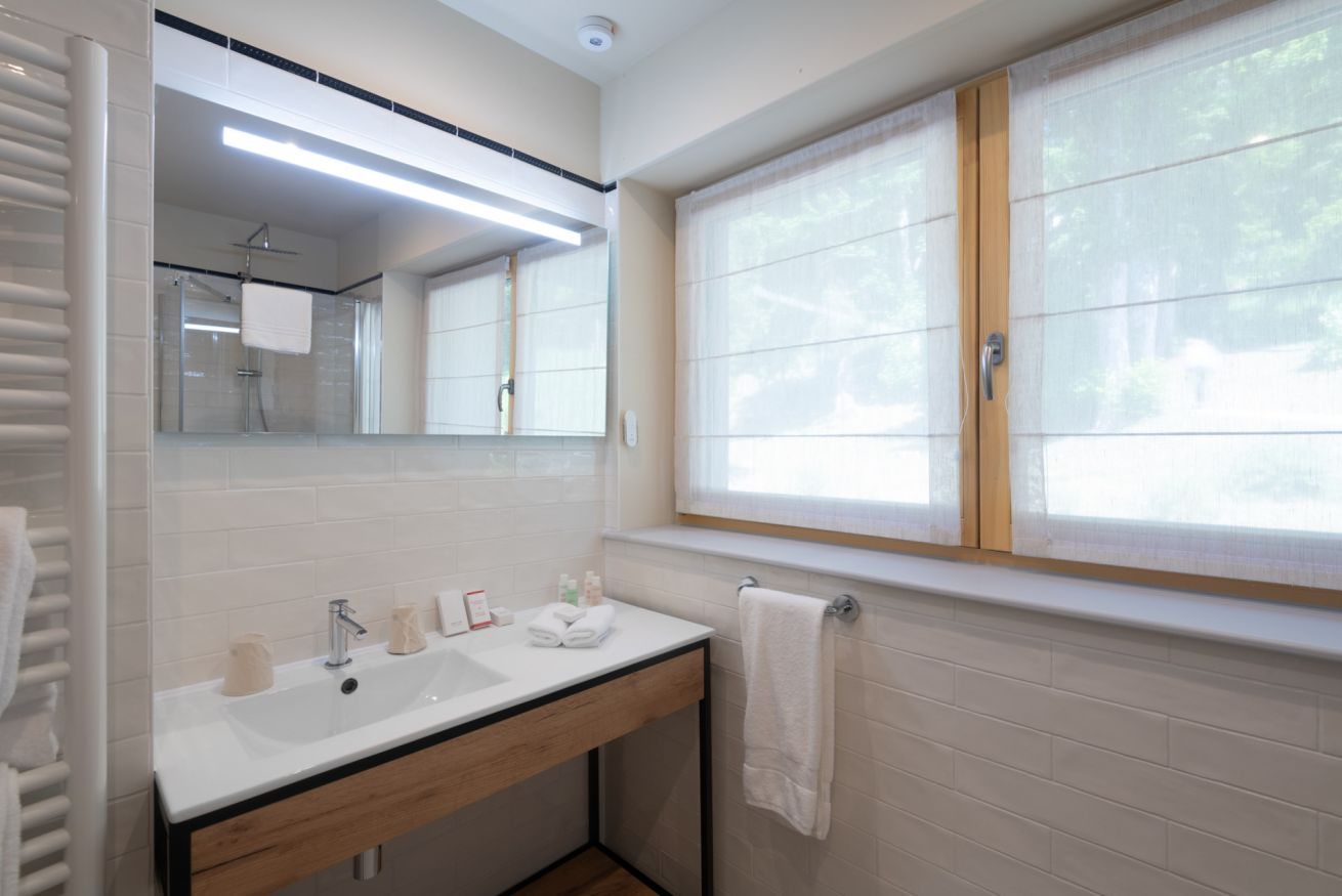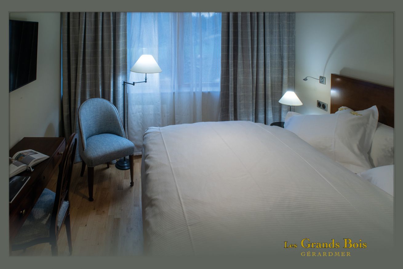 Chambre double de 20 m² vue parc dans la villa des grands bois qui se situe dans le parc de l'hôtel à 150 mètres du bâtiment principale. 1 lit double de 160 cm ou 180 cm de large – Kitchenette – Salle de bains avec douche à l’italienne avec peignoirs, chaussons. TV écran plat, chaînes internationales, téléphone, WIFI gratuit. La piscine, la réception et le restaurant se trouve dans le bâtiment principal.